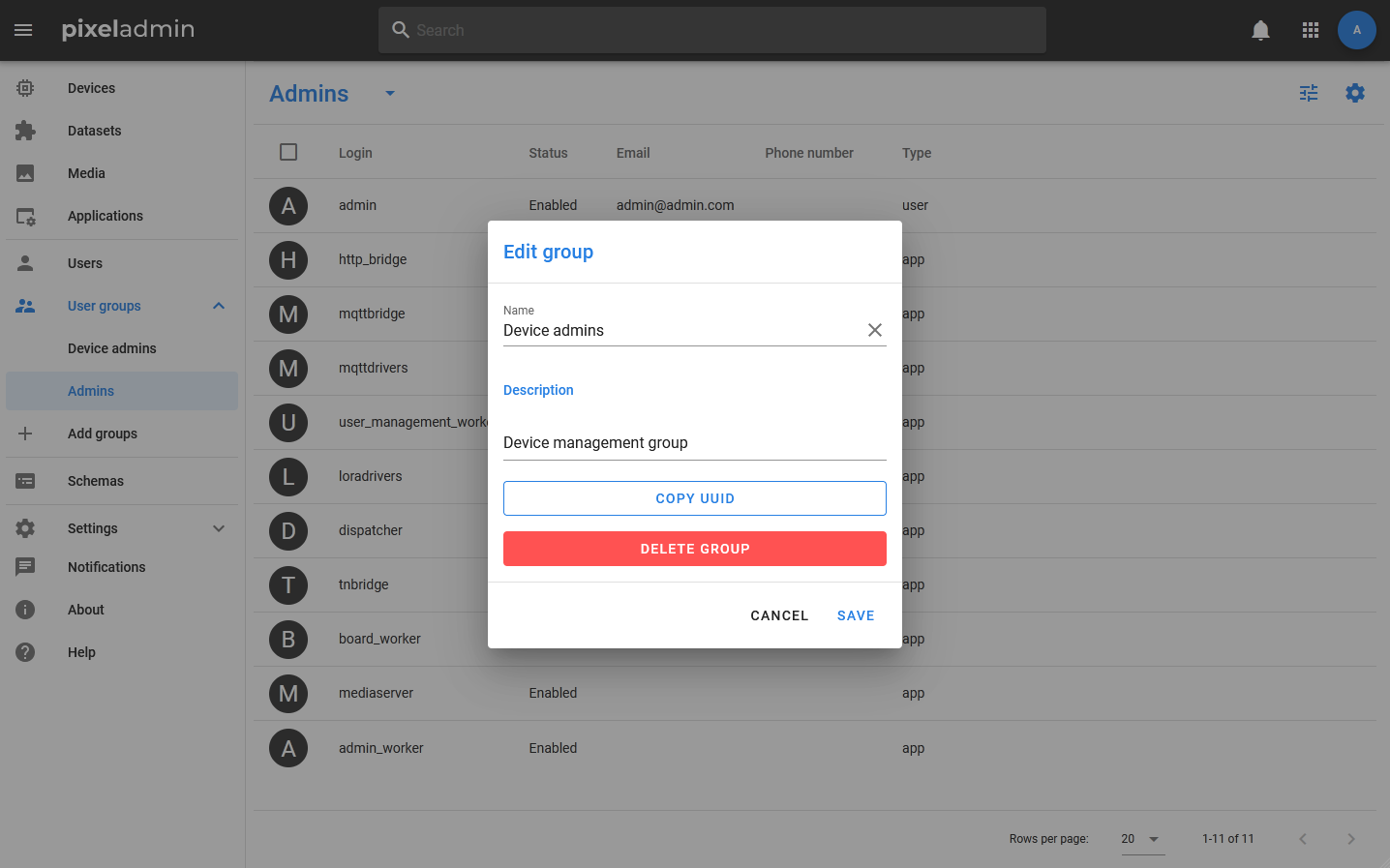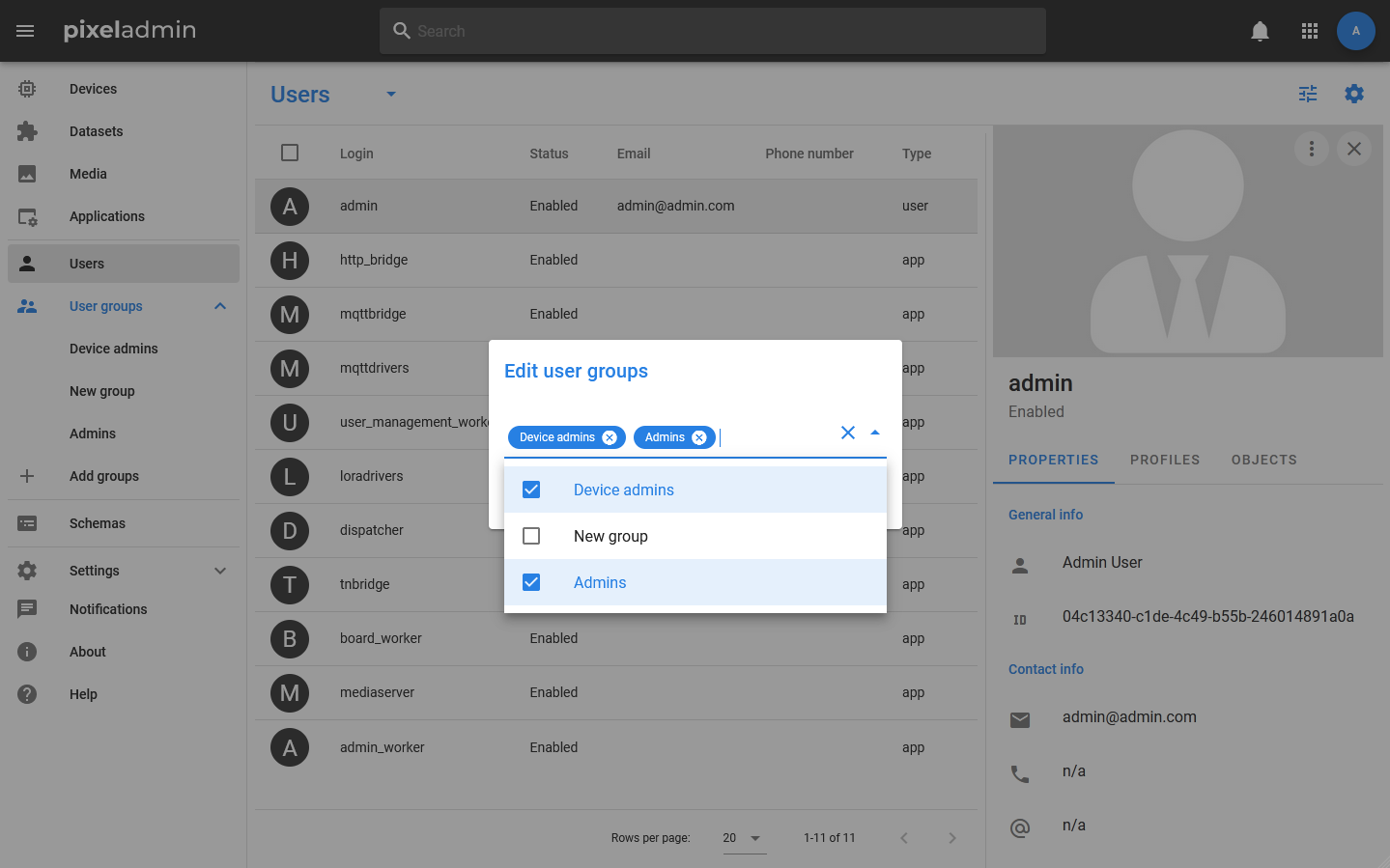 Groups are displayed in the menu, there are also controls for them: to add a new group, use the menu item + Add group, for editing, deleting and viewing information — action button in the menu bar. If the user does not have rights to edit the group, then clicking the action button will open an information window, if there is an edit window.