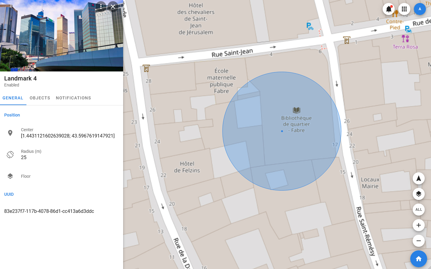 Landmarks are primarily designed to track the geographical position of objects (their approach and distance from certain points on the map), but they also have an additional function. Indoor plans displayed on top of the map and images that simplify the relationship between real objects and objects on the map can be linked to the landmark.