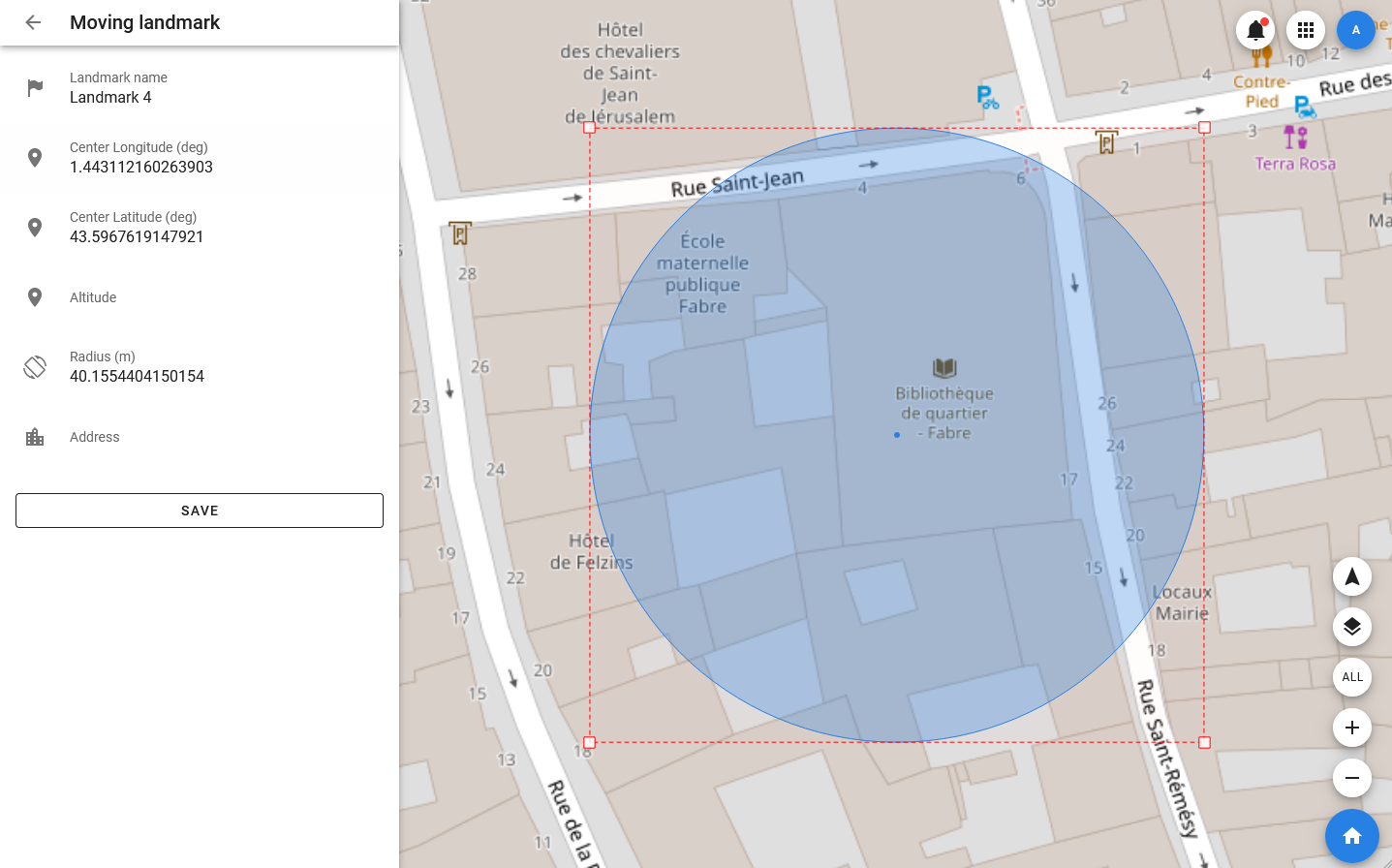 A landmark is a circle-shaped area for which the name, center, radius, and height parameters are set. An object is considered included in the landmark if it is located inside the circle, that is, it is closer to the center by a distance less than the specified radius.