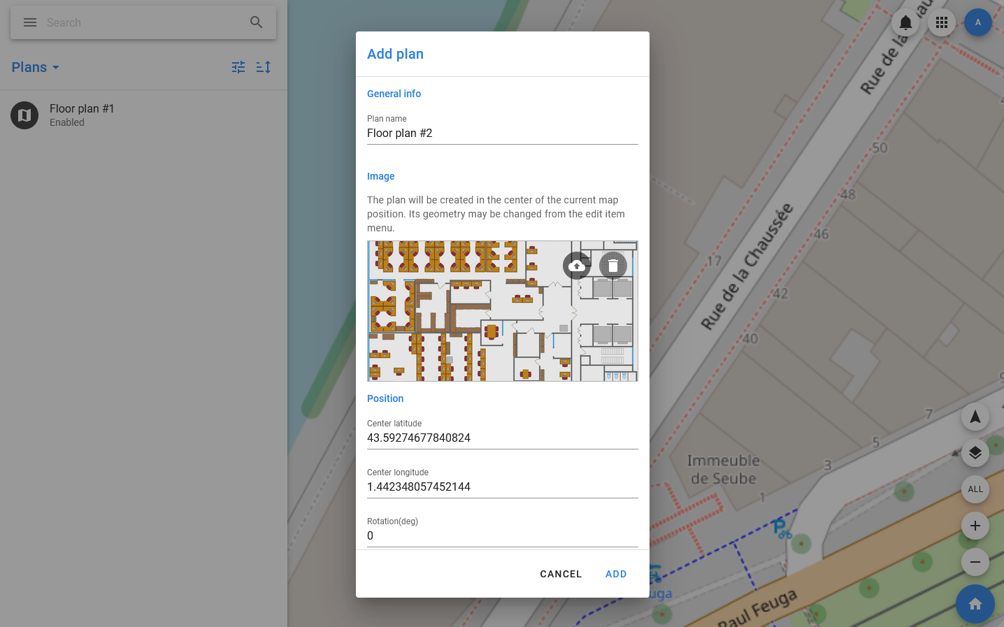- In the modal window that opens, specify the name of the plan, select the desired image (the file system dialog opens), if necessary, specify the width and height in meters and the rotation angle (if they are not exactly known, they can be changed in visual mode), and a description.